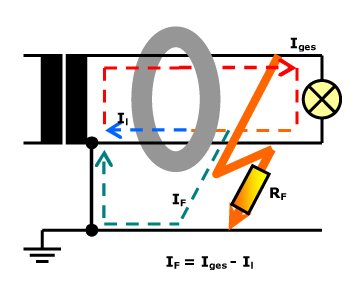 If fault current flows via earth, the current difference will cause a current in the current transformer. This is evaluated by electronics.
