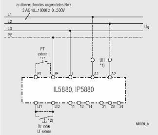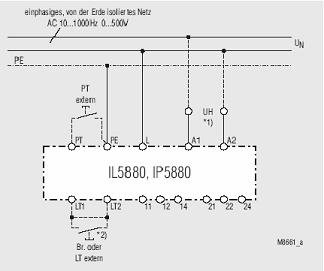 Flexible by extended application range of our insulation monitors for systems up to 500V AC and 1000 Hz, i.e. also application for 400V three-phase systems Monitor DC systems up to 280V without auxiliary voltage